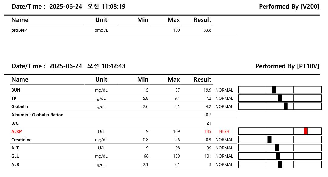 → proBNP ์์น(์ฌ์ฅ ์คํธ๋ ์ค ์งํ)๊ฐ ์ ์์ผ๋ก ๋์๋ ๊ฒ๊ณผ ์ผ์น.